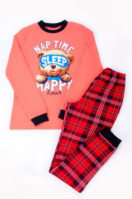 Полотно: футер з начосом. Тепла піжама для дівчаток з футера з начосом, з принтом, виконаним методом шовкотрафаретного друку. Кофта з довгими рукавами і округлим вирізом з однотонного полотна світлих кольорів. Штани прямі на резинці по талії, виконані з принтованого полотна в клітку. Футер з начосом натуральний за складом, дуже приємний до тіла, дає усадку після прання. Полотно: футер з начосом. Склад: 100% бавовна Рекомендації по догляду: прати при температурі не більше 30°C. Допускається машинне прання в режимі "ручна" або "делікатна", принт прасувати тільки з вивороту. При збільшенні температури дає усадку з-за наявності бавовни в складі.