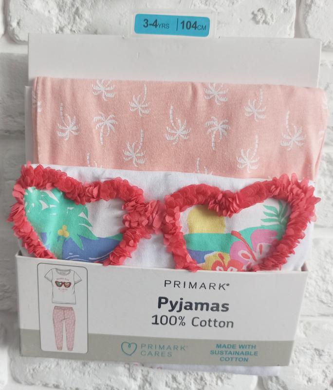 Піжама на дівчинку Primark. Розміри: 98(2-3) : довжина футболки 415, ширина 32см, довжина штанів 56см, кроковий шов 36,5 см, ширина по талії 23,5 див. 104(3-4) : довжина футболки 42,5, ширина 33,5 см, довжина штанів 60,5 см, кроковий шов 40см, ширина по талії 25,5 див. 110(4-5): довжина футболки 45,5, ширина 34см, довжина штанів 64см, кроковий шов 41см, ширина по талії 26см. Склад тканини: 100% коттон. Країна-виробник: Бангладеш