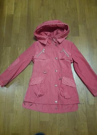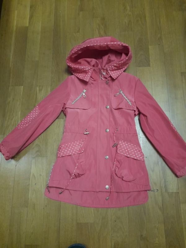 плащик з плащовки на нейлоновій підкладці, з капюшоном , рукав на резинці є для краси латки в білий горошок, є блискавка і кнопки, в поясі резинка ззаду , спереду є два шнурочки , кармани з клапанами , оздоблені також білим горохом.Знизу по боках є блискавки.Колір таракот.Тканина водовідбивна, дощик стікає 122 розм по плечах 33см , по грудях 75см, довж рукава 47см , ширина рукава 28 см , довж по спинці 51см , перед коротший на 5см