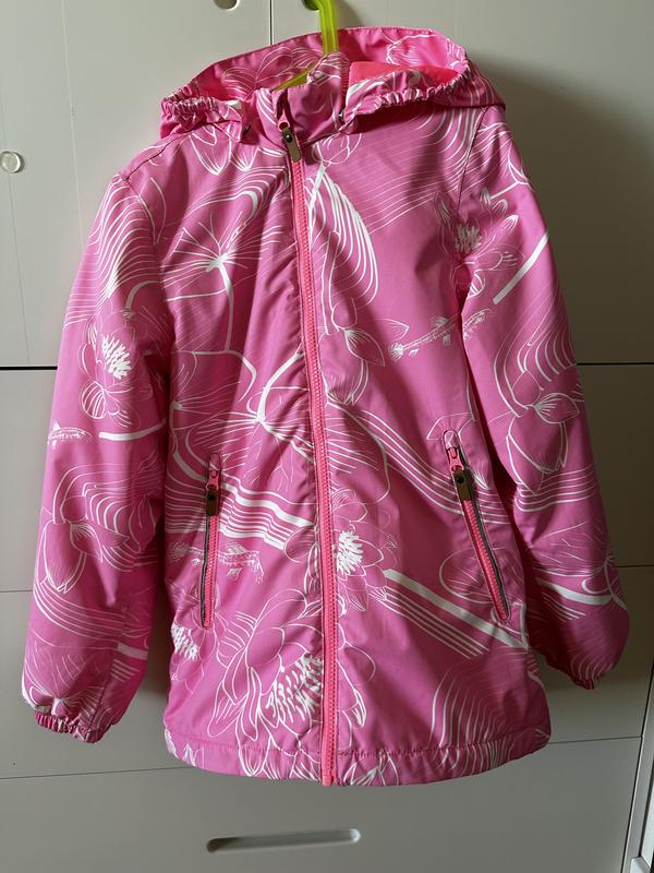 Дуже гарний і якісний плащ-дощовик Reima 146 см на дівчинку, який не парить і не продувається, досить теплий, з підкладкою, відстібний капюшон. Недоліки: трішки затерті рукава з внутрішнього боку, маленька рисочка на капюшоні. Етикетка трохи потерлася, але її можна акуратно відпороти. Фурнітура працює, без недоліків.
