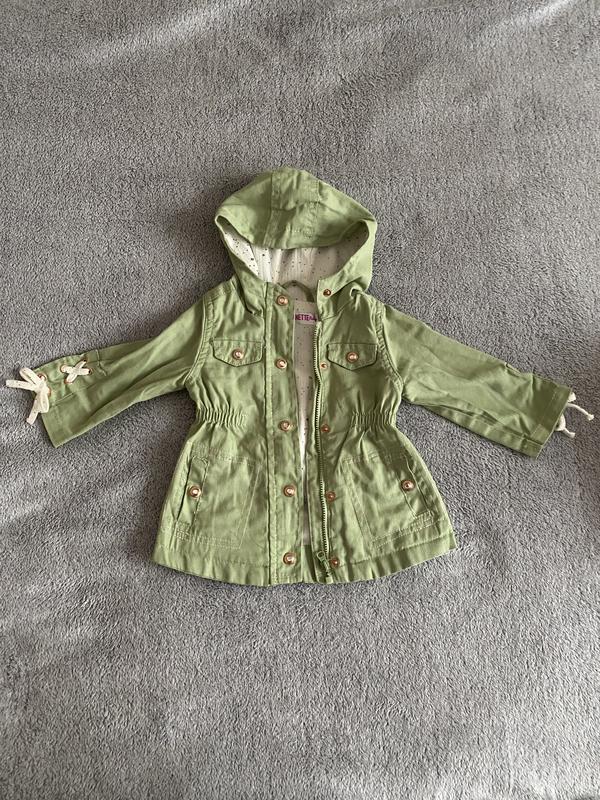 Плащик зеленого цвета, с очень приятной подкладкой для девочки на теплую осень весну.3-6 м. Новый.