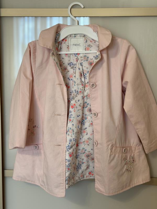 Плащик Next, 110 розмір, приємного пудрового кольору, на квітчастій підкладці. Є кишені, капюшон, застібається на ґудзики, оздоблений ніжною вишивкою, в ідеальному стані. Заміри надам за запитом.