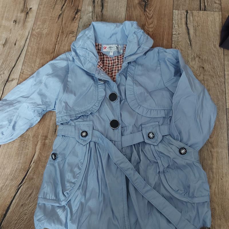 Тоненький плащик на теплу осінь/весну. дуже приємного блакитного кольору . на зріст 98-110 довжина 49см ширина33 см довжина рукава36 см
