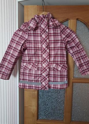 Фирменный плащик на девочку 4-6 лет, рост 110-116. Стан очень хорош, носили мало.Застежка молния+кнопки. Капюшон на кнопках, отстегивается. Длина 54см, между руками 37см, длина рукава 45см, плечи 29см.