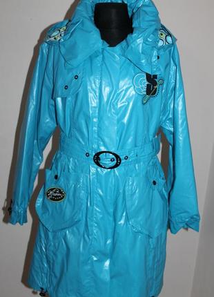 Класний новий плащ з водовідштовхуючої тканини, присланий з Європи, розмір 140 вказано.В кашоні ( відстібний) підкладка котонова.Довжина- 73,5см, плечі-40см, рукав від плеча-48см, пог-48см,пот-48см( ремнем стягується),