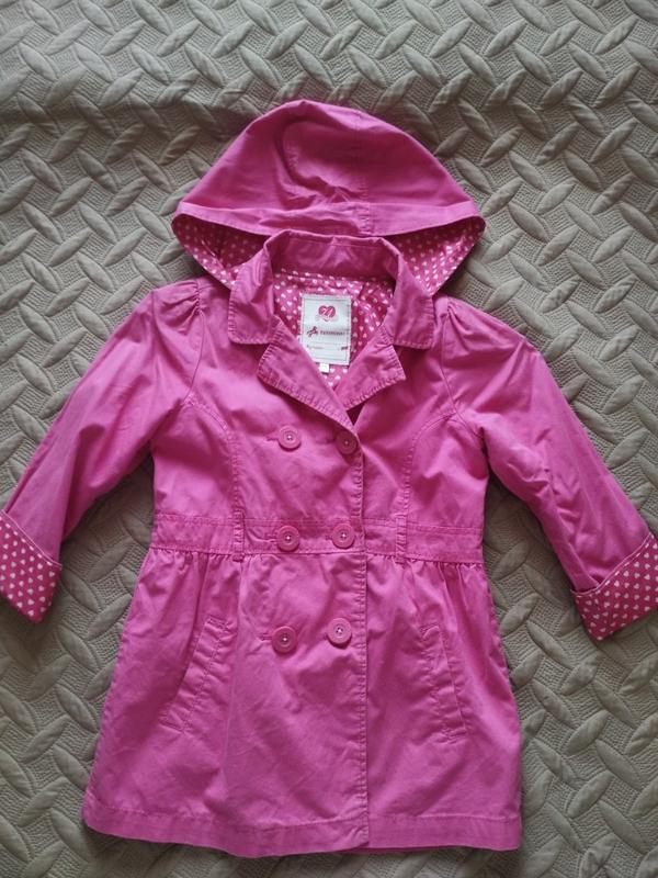 Весняний тренч яскраво рожевого кольору, на підкладці, розмір 128. Є невеликий дефект (останнє фото) - плямки біля гудзики (має відіпратись)