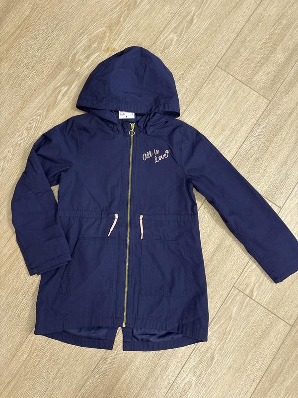 Плащ для дівчинки т.синій новий на замку,внутрі резинка для стягування.Капюшон отстегиваеться,розмір 8-9 років