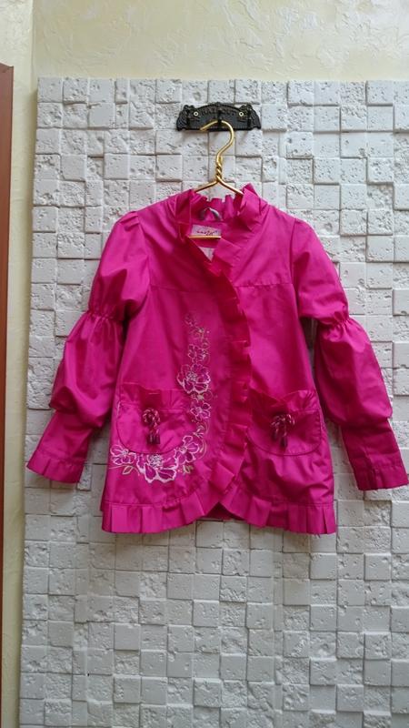 Плащ Lux&K для девочки ростом 98см. Возраст 2- 3 года. Цвет ярко - розовый. Силуэт расклешённый от линии плеча, с пышными рукавами,украшен рисунком, оборочками и красивыми шнурочками. Застёжка на пуговицы. Ткань - тонкая лёгкая плащёвка 100% полиэстер, подкладка 100% хлопок. Длина 55см, окружность груди 66см, длина рукава 46см. Состояние очень хорошее.
