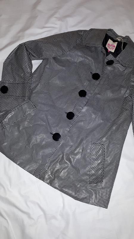 Плащик,цвет белый горошек на сред не-сером.Приятная мягкая ткань. Смотрится стильно дорого и красиве нно.Силуэт чуть трапецией. 2 карма на. Длина 67см,плечи 32,5см,грудь 47см,низ 60см,рукав 59см. Указан размер 12-13лет, рост 152-158см. Ткань не шелестит как курточная. Большие пуговицы,есть запасная. Если надо еще фото - дошлю. На подкладке. Доставка УП, НП или Джастин