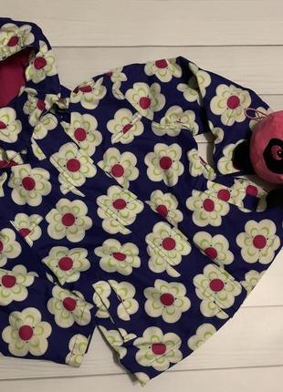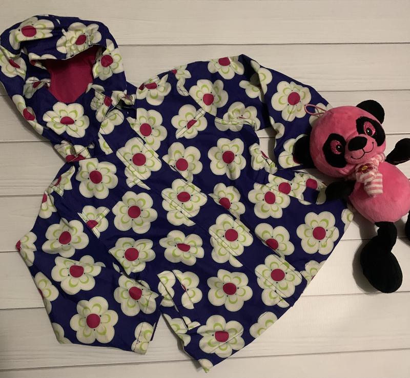 Курточка-плащик,яскравенька . Стан ідеальний-розтягнуті лише шнурочки,знизу{на фото показала,в ціну врахувала} Капішон відстібний. Рукав-38 см,довжина плащика-45,5 див.,плечі-30 див.