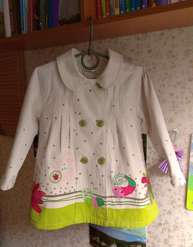Дуже красивий легкий плащ на 3 - 4 роки, Коттон і основна тканина і підкладка. Є 2 кишеньки, прикрашений аплікацією. Не вистачає однієї гудзички Станів ідеальне, одягали мало. Добре переться, не дивлячись на те, що коттон. Плащ хорошої якості.