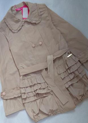 Очень красивый плащик на 6/7 лет, (цена по бирке 79.90 евро), без подклада, на молнии, сверху прикрыта кнопками, на талии поясок очень красивая фурнитура, фирма итальянская дорогая, качество на высоте замеры: об. дл. 60, пог 36, по плечам 33, рукав 47
