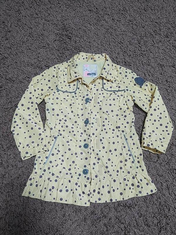 Симпатичний плащик для дівчинки в гарному стані. Застібка на липучках, коли застібнутий виглядає, як на гудзиках. Підкладка трикотаж. Є кишені. Був капішон, але загубився. По етикетці на ріст 122 див. Колір білі-жовтий в рожевий горошок, на фото колір не передався гарно.