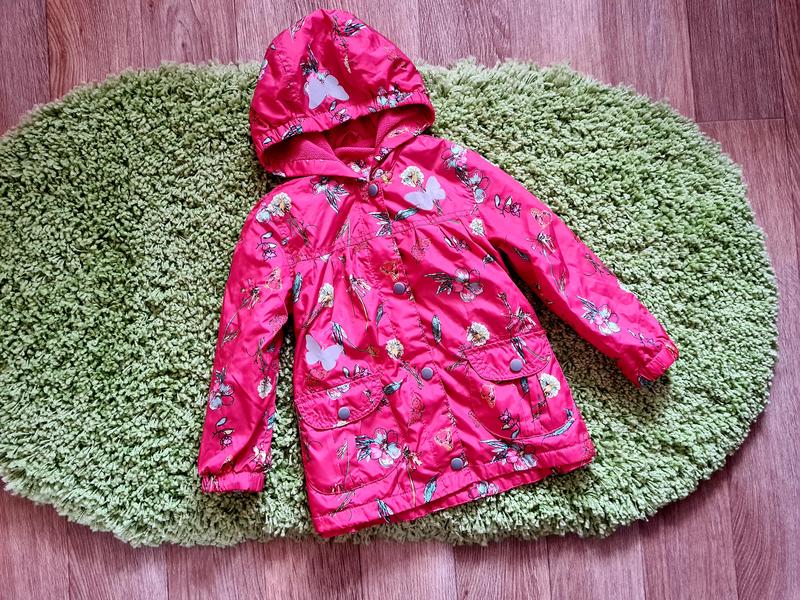 Шикарная ветровка на флисе фирмы Nutmeg.Размер 4-5 лет,на рост 110 см. В общем состояние-она как новая! НО ЕСТЬ НЮАНС, ровный порез около 2 см, в реальности вообще не заметно на ткани, можно аккуратно зашить или приклеить нашивку. Светоотражающие бабочки,показала на фото. Цвет точно как на фото, очень красивый. Не красный, но и не розовый. Снаружи водоотталкивающая,непродуваемая ткань,внутри на флисе. Сзади немного удлинена. Замеры: Длина от плеча до низа 47/50 Ширина под ручками 37 Рукав от плеча 39 Плечи 29