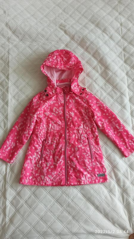 Чудовий фірмовий плащик у сердечки. Присутні незначні дефекти (видно на фото), проте при носці не замітно. Верх - плащівка, підкладка- котон. Капюшон відстібається.