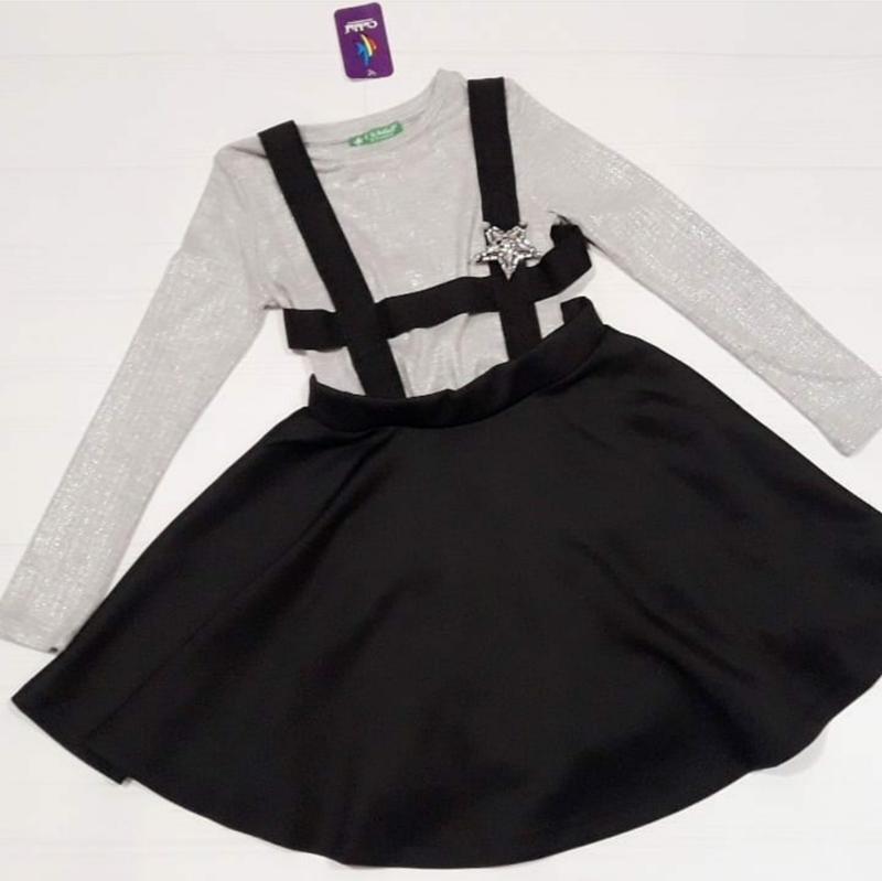 Дуже класний комплект на дівчинку сарафан з регланом. Сарафан чорного кольору, верх сарафана пошитий з широких гумок які відстьогуються і можна носити як спідницю. на сарафані також є гарна брошка. Реглан сірого кольору з блискучим напиленням. Можна одягати сарафан на блузи чи сорочки. Дуже зручний. Виробник Туреччина фірма Cıchlıd.