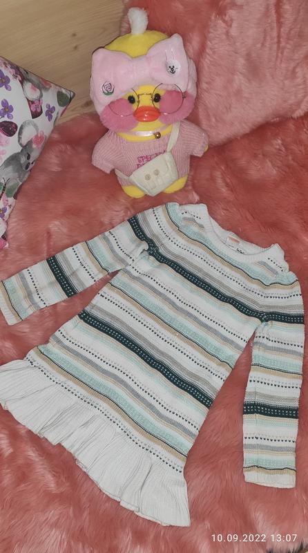Гарне в веселе в'язане платтячко в різнокольорову смужку. Стан ідеальний. Виглядає дуже мило. Гарно підійде для осені і весни. Заміри зроблю.