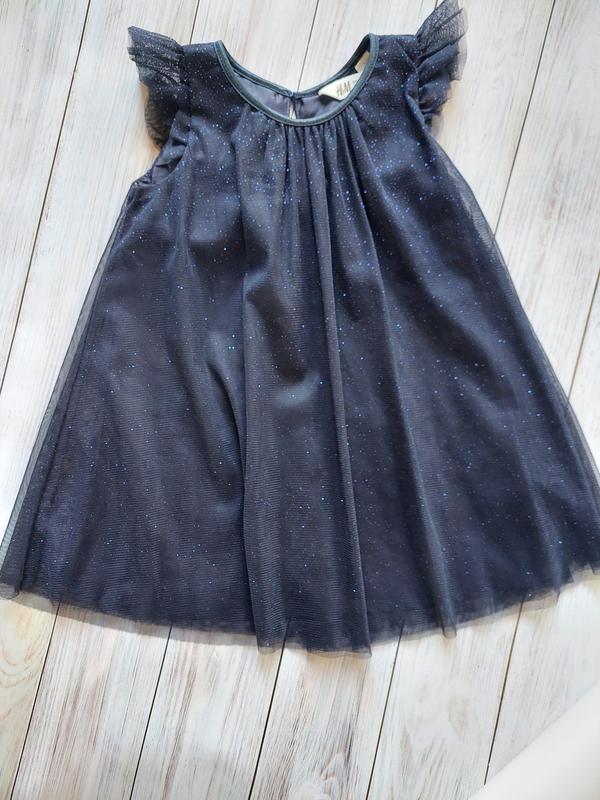 Сукня нова, без бірки. Не носили. Колір дуже гарний темно-синній з блискітками. Пошив - трапеція. Дуже мило виглядає. Заміри: довжина 52 см.