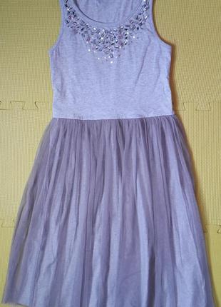 Плаття Next (Індія) на 8 років (128 див.) Довжина 79 див. Грудей 29,5 див. Пояс 30 див. Склад тканини - 100% котон. Колір сірий. Дуже красиве і стильне. Стан ідеальний! Всі камінчики і паєтки на місці (нічого не пооблітало). На фатіні затяжок нема. перешлю