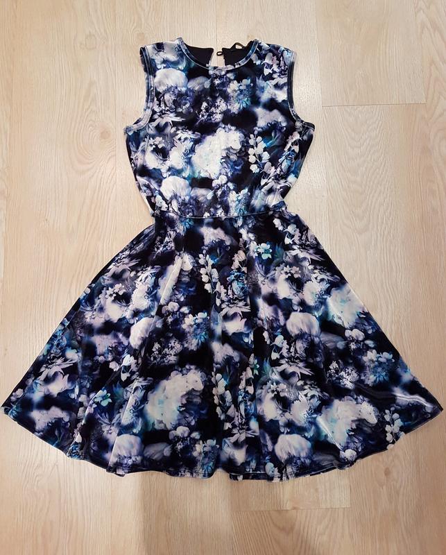 Дуже рекомендую. Красива забарвлення в стилі Дольче Габана, темно синій з переходами, блакитний, з проблисками зеленого, бархатиста основа. Сукня стрейчевое, мало точно не буде. Довжина 81см, пог 40см, пот29см на резинці в спокійному стані. На лейбі 11-12р. Зріст 146-152см.