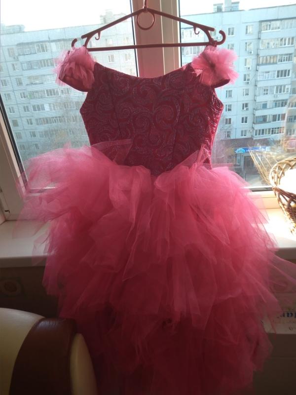 Одевалось 1 раз. Платье сзади на корсете. Сзади длиннее. Шилось на заказ. Примерно на рост 134