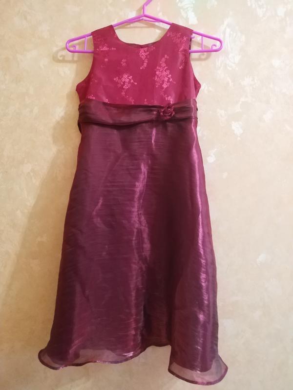Нарядное платье для девочки, винно-красного цвета. Сдержанное (без лишних украшений), но при этом очень красивое. Приталенное (регулируется поясом-бантом), впереди есть украшение - розочка