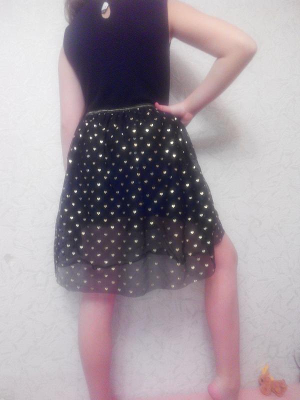 платье черное в золотые сердечки на фатине юбочки ,верхняя часть хорошо тянется ВЫСОТА ПЕРЕД 63 СМ ЗАД 73 СМ ВЫСОТА ТОПА 30 СМ В ГРУДИ 33-43 СМ по бирке рост 122 в реальности на фото ребенок 138 см