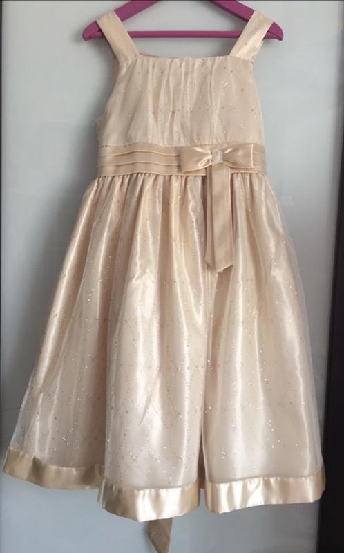 Ошатне плаття бежевого кольору. Підійде як дівчинці 4-5 років ( буде в підлогу, а за рахунок поясу утягивается у талії), так і на 7-8 років. Заміри і додаткові фото за запитом.
