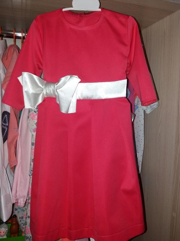 Сукня в новому стані. Одягнене на рік і ще раз на свято в дитячому саду. Рукавчик 3/4, що дуже зручно). Шили на замовлення з дуже хорошої тканини (толтко тканина обійшлася в 300 грн). Ззаду великий білий атласний бант і гудзички від шиї до пояса. Попереду маленький бант.