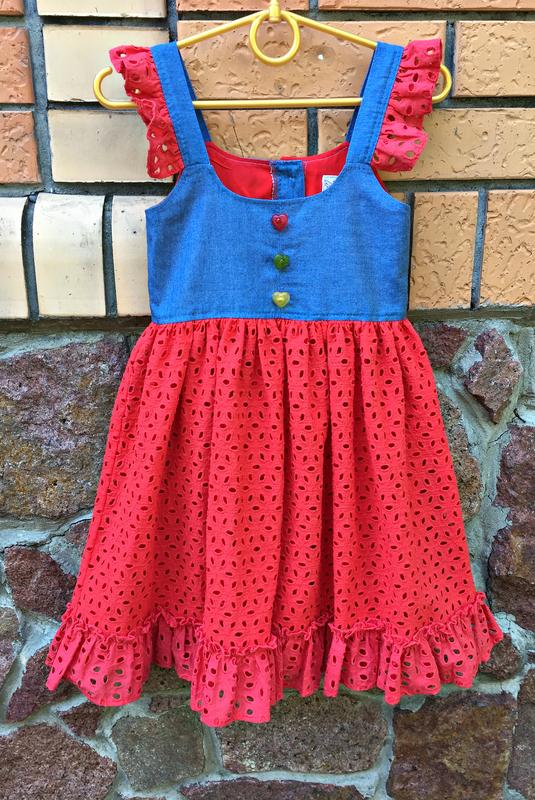 Плаття для дівчинки, із прошви і джинси, підкладка - віскоза, на спинці застібка - гудзики. Обхват грудей 28 см (56 см), довжина 63 див. Якщо потрібно, є фото клієнки.