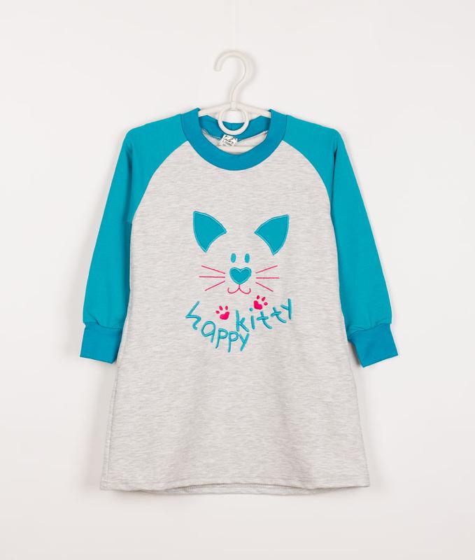 Сукня для дівчинки з довгим рукавом Сірого з бірюзовим кольору та малюнком котика. На рукавах манжети