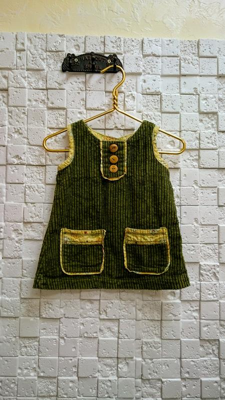 Сарафан платье для девочки 1 - 1,5 года, рост 86см. Из мягкой вельветовой ткани. Цвет тёмно - зелёный (оливковый), мягкая ткань 100% хлопок. Силуэт "трапеция", с двумя карманами, контрастной отделкой и застёжкой на стильные деревянные пуговицы. Длина 38см, окружность груди 54см. Состояние идеальное - почти новый.