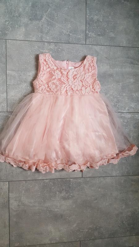 Плаття нарядне, красивого ніжно рожевого кольору.Ззаду на блискавці. Верх мереживо,низ фатін. На три подюпника. Заміри: Діна вироби 50см. Плечі 24см. ПОГ 29см. ПІТ 27см.