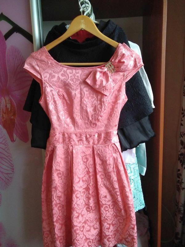 Тканина щільна, фактурна, добре тягнеться. Гарний кораловий колір. Бант на грудях пришитий. Вся довжина 82 см, пахви 39 см. Стан гарний, дефектів немає.