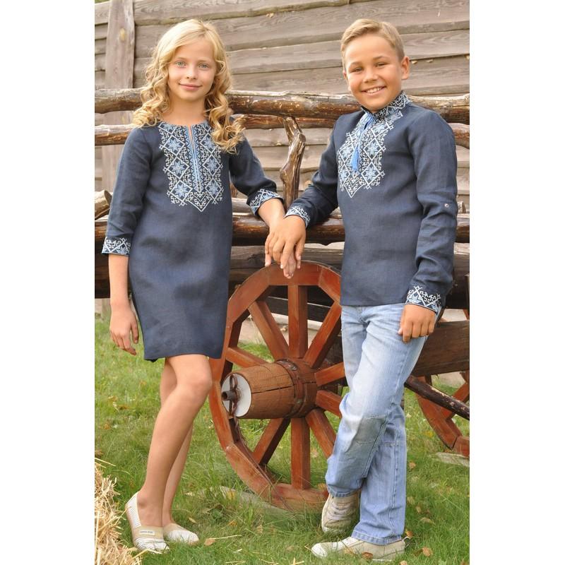 Вишитий комплект для дітей - вишиванка для хлопчика та сукня для дівчинки з виразним орнаментом Моделі ДМ01/1-293 та ДП01-293 Перед замовленням,запитайте про наявність відповідного розміру! Хлопчик:104,110,116,122,128,134,140(146,152+10%) Дівчинка:104,110,116,122,128,134,140(146,152+10%)(158+20%) Вишита сорочка зі стійкою і довгим рукавом для хлопчика та сукня з рукавом 3/4 для дівчинки. Тканина - 100% льон. Колір тканини: темно-синій. Колір вишивки: молочний, голубий. У візерунку використано елементи слов'янської вишивки, а саме обережний символ Алатир. Його зображення на сорочці-вишиванці надійно оберігає дитину від хвороб і дарує благополуччя. Так чарівно можуть виглядати ваші діти на будь-якому святі чи фотосесії. Замовляйте цю чудову пару та отримуйте знижку - 5%. На фото моделі: розмір 146 (сорочка) та розмір 146 (сукня).