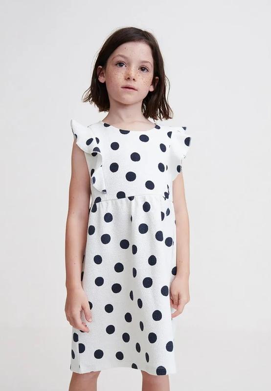 ОПИС ДО складу входить бавовна. Прямий фасон. Фактурна вичинка. Принт в горошок. Круглий виріз горловини. Короткі рукави з воланами. СКЛАД - 70% бавовна, 27% поліефіру, 3% еластану (тканина відмінно тягнеться, схожа на трикотаж) Розміри в наявності: 7-8лет(128см): довжина від плеча - 65 см, довжина від плеча до шва - 24см, ширина по спинці - 32см, шир.по плечах - 31см; 9-10років(140см): довжина від плеча - 69 см, довжина від плеча до шва - 25см, ширина по спинці - 34см, шир.по плечах -32см.
