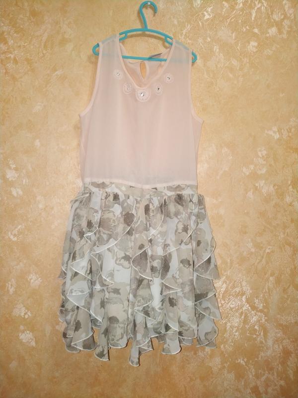 Легке цікаве плаття для дівчинки. Шифоновий верх, прикрашений вишитими елементами із стразами і "струмуюча" спідниця (по спині на поясі вшита гумка для регулювання обхвату пояси), є під'юбник. Стан ідеальний, як у нової речі У зв'язку з умовами продажу на Шафі (15% від вартості, але не менше за 10 грн), речі з маленькою вартість продаються за умови придбання на загальну суму від 70 грн