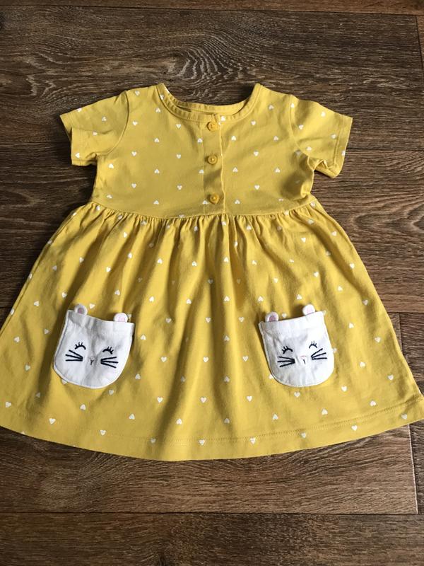 Гарний літній сарафанчик на дівчинку. Жовтого кольору з візерунком білі сердечка і кишеньками кішечки. Розмір 12 місяців, на ріст 80 см