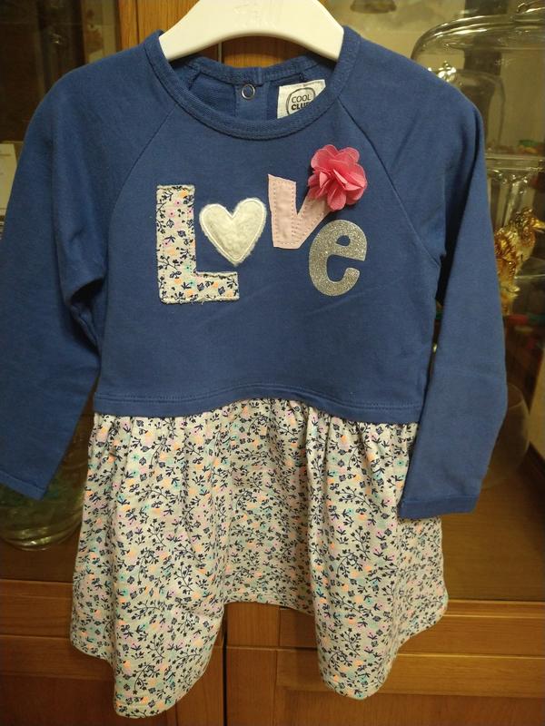Дуже гарне, м'яке трикотажне плаття. Одягнено 1 раз вдома на день народження і вже було сильно впритул. Оригінальне виконання поєднання кольору і матеріалу. Декороване написом і квіточкою з тканини. Застібається ззаду на 2 кнопки. Дуже красиве і зручне. Можна одягти як на свято, так і на прогулянку.