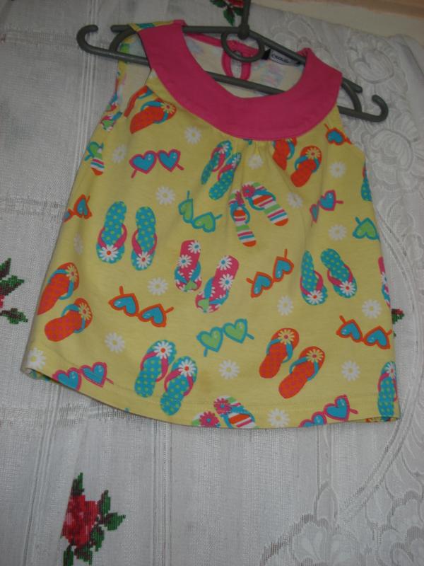Шикарное платьице желтого цвета с яркими тапочками,сердечками,фирменное,натуральное,застегивается сзади на пуговичку,вырез розового цвета,спадает к низу колокольчиком,длина-38см.