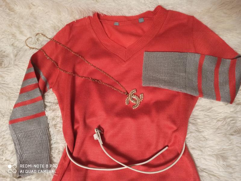 Красиве плаття-туніка для дівчинки. Можна носити як з лосінами, так і з колготками. Рукав 3/4. Ефектності додає люрексова нитка на сірих смужках. Дефектів немає. ПОГ - 39 ПІТ - 37 ПОБІДИ - 38 Довжина - 73 Довжина рукава - 41 Пояс у комплект не входити. Підвіска у подарунок.