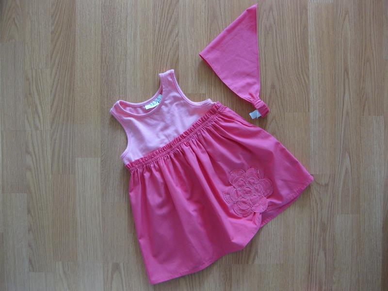 Красивый комплект на лето. Размер 2Т. Болшемерка, нужно ориентироваться на замеры. Можно носить как платье, а позже как тунику) под лосинки или шортики. Замеры платья длина 45см, ширина под мышками 27см на резинке. Состояние отличное.