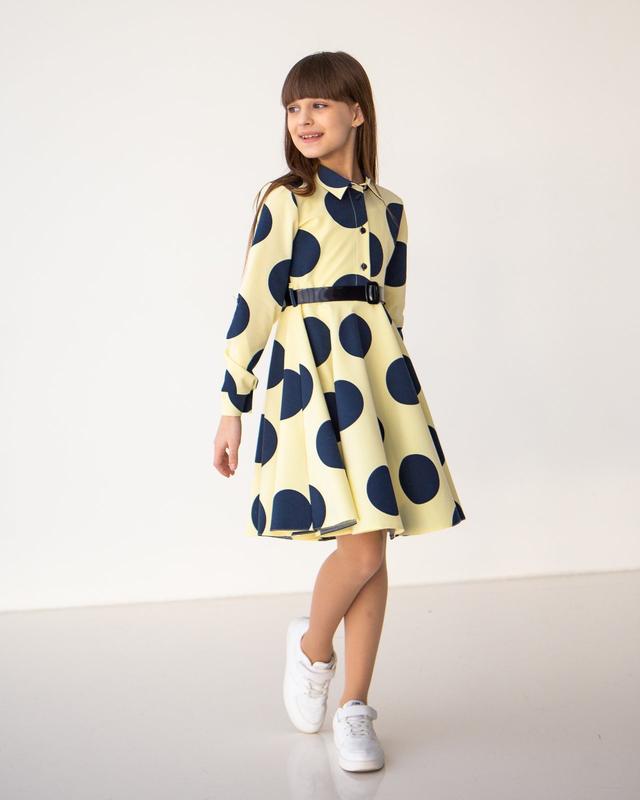 ЦІНА-540 Шикарне плаття для дівчинки у великий горох. Передня планка сукні застібається на гудзики, є відкладний комір сорочкового типу. Рукав трансформер за рахунок якого можна регулювати довжину рукава і носити як довгим, так і 3/4. В комплект входить ремінь. Спідниця повний кльош!!! Розмір: 134,140,146,152,158 зростання Тканина: натуральна стрейч-котон 134рост: довжина-70см, рукав-48 см, напівобхват грудей-33см, напівобхват талії-31см 140рост: довжина-74см, рукав-50 см, напівобхват грудей-34см, напівобхват талії-32см 146рост: довжина-77см, рукав-53см, напівобхват грудей-35см, напівобхват талії-32см 152рост: довжина-81см, рукав-55см, напівобхват грудей-37см, напівобхват талії-34см 158рост: довжина-86см, рукав-57см, напівобхват грудей-38см, напівобхват талії-34см ВИМІРИ (зроблені в ручну за 1 ростовці, можлива розбіжність +- 1-2 см)