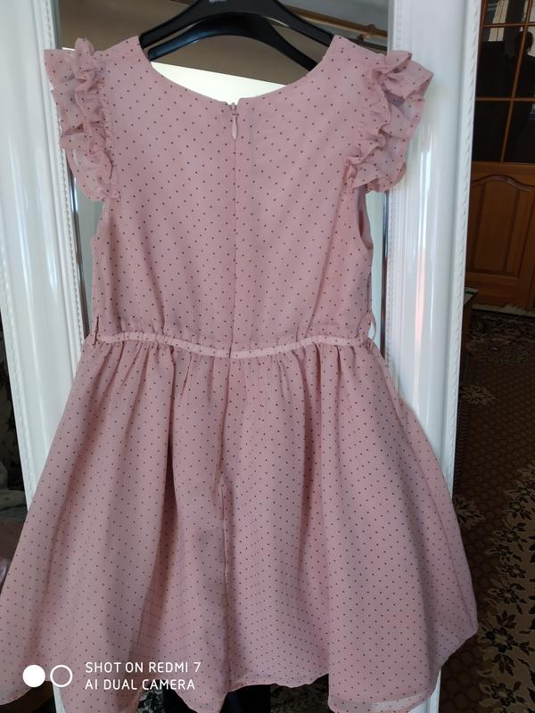 стильное платье пудрово - розового цвета в мелкую темную точку фирмы Monsoon на возраст 5 лет, рост 110, на спинке замочек. Замеры: полуобхват груди 28 см от плеча до талии 20,5 см от талии до низа 36,5 см общая длина 57 см
