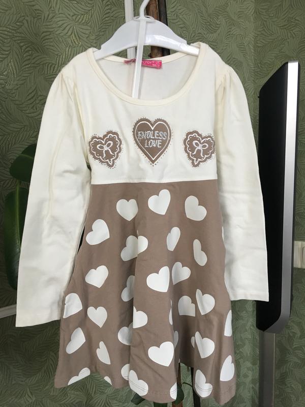 Продам платтячко, розмір - 98. Колір - бежевий з коричневим, в сердечка. Заміри: довжина - 52см., пояс - 26см., рукав від плеча - 37см., плечі - 23см. Віддам за 100 грн. без торгу. Запитуйте, з радістю відповім)))