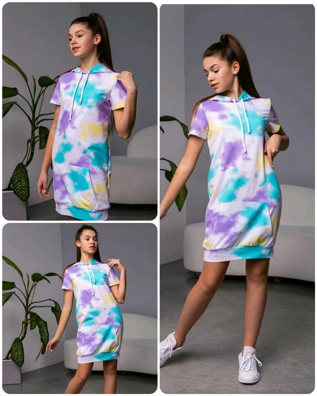 Платье-туника в стиле Тай дай с капюшоном 🧋ткань двунитка пенье КАЧЕСТВО СУПЕР! размер/🧋длина/пог 134/🧋72/36-3шт 140/🧋73/38-3шт 146/🧋76/39-3шт 152/🧋78/41-2шт 158/🧋81/42-1шт +-2см