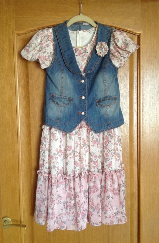Сукня на дівчинку, на 9-10 років. Б/в. У комплекті з жилеткою. Можна носити незалежно один від одного. Підійде і в якості святкового вбрання, і, в той же час, можна носити і в повсякденному житті. Також для повноти образу є брошка з тієї ж тканини, що і сукня. Стан хороший, носилася мало. Заміри (приблизні): - сукня - напівохват грудей - 37 см, довжина - 87 см - жилетка - напівохват грудей - 37 см, напівохват талії - 37 см, по низу (напівохват) - 40 см, довжина по спинці - 40 см