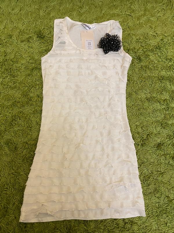 Плаття від new look. Спереду з рюшами, оздоблене брошкою. На вік 14-15 років, ріст 164-170 див. Може підійти і на S. Тканина тягнеться.