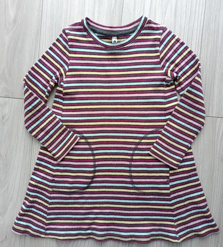 Стан хороший, є маленькі плями на рукаві від фломастера і знизу плаття. Склад тканини:95 %бавовна, 5 % еластан. Заміри: довжина по спинці від шиї до низу 50 см, рукав від плеча 38 см, ширина під руками напівобхват 30 см, ширина по плечах 25,5 см.