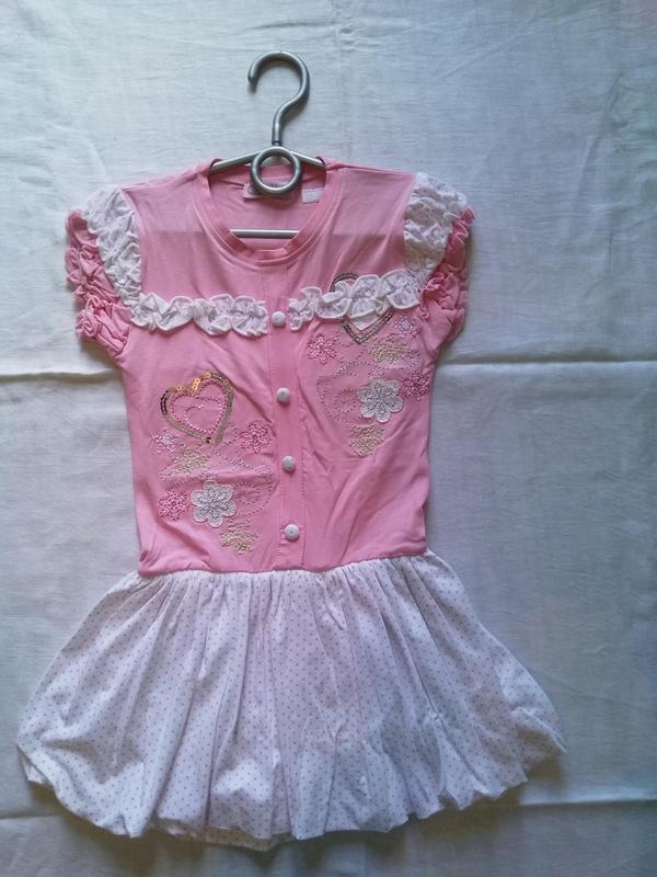 Нове плаття з якісного бавовняного трикотажу. Виробництво Туреччина . Ширина під проймами 27 см. довжина 55 див. Красива вишивка з паєтками. Талія занижена. Спідниця-балон. Буде добре на худенькій дівчинці.